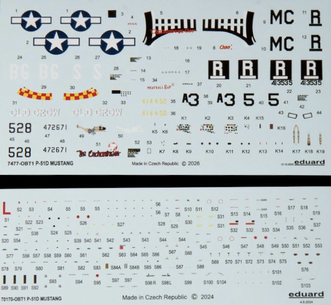 Iwo Jima VLR Mustang Decals: Eduard has again included decals for 528 “The Enchantress” (P-51D-25-NA, 44-72671), a 457th FS, 506th FG Mustang flown by 2nd Lt. William E. Saks. Unfortunately, 2nd Lt. Saks was one of the pilots lost on the infamous June 1, 1945 “Black Friday” mission, but he was not flying 528 on that day. “The Enchantress” is popular amongst modelers because the nose art and the Albert Varga pin-up girl that adorns the fuselage.