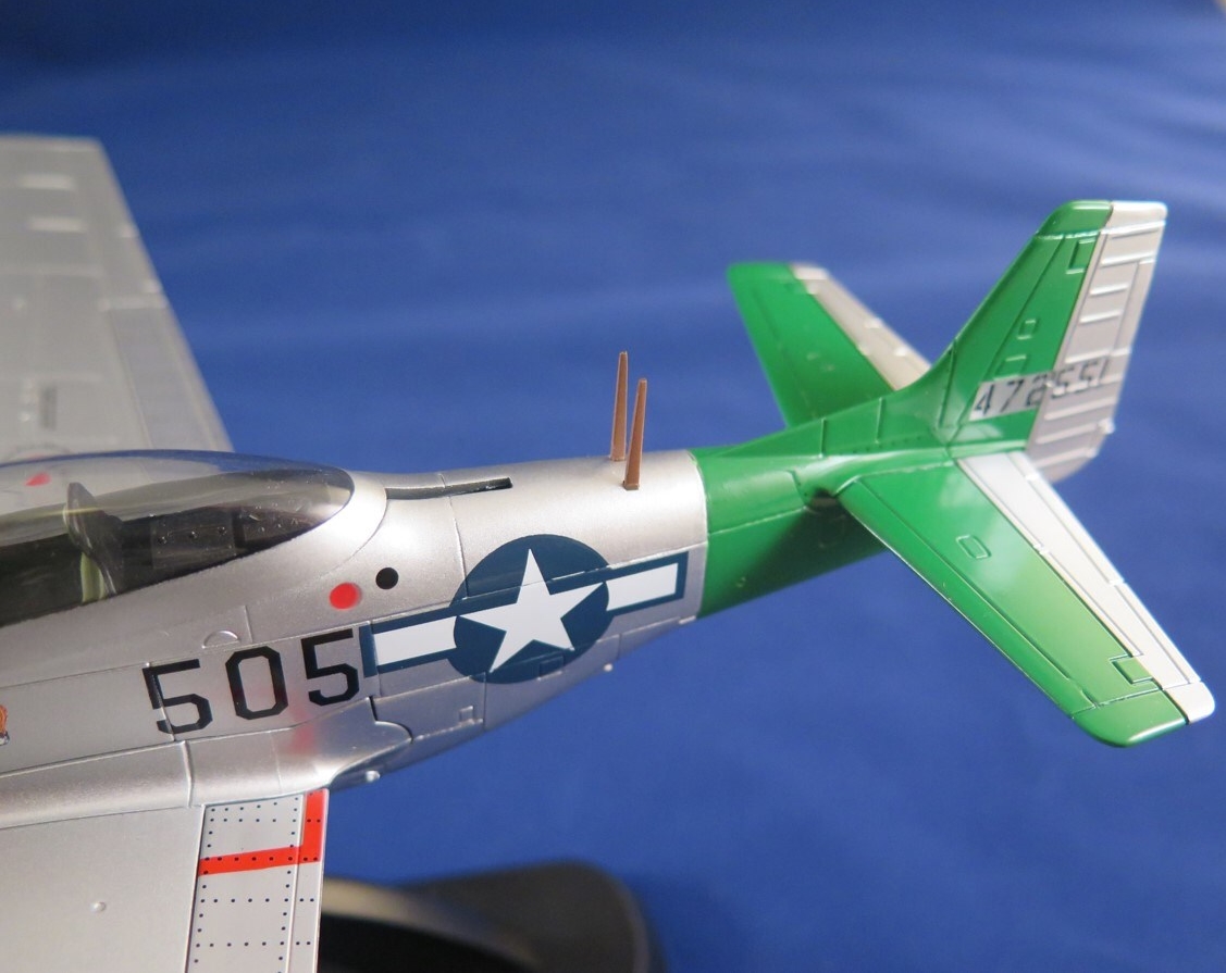 Hobby Master has done a very nice job of reproducing the aircraft markings, from the 457th Fighter Squadron badge to the Alberto Vargas pin-up art that adorned the fuselage of Captain Aust’s plane below the canopy. They included the twin Uncle Dog antennae and the relocated single mast antenna under the fuselage in front of the wheel wells. The drop tanks are the 75 gallon tanks, which are not accurate, but the casual observer will not make the distinction. I think I will replace the 75 gallon drop tanks with accurate 110 gallon drop tanks from Eduard.