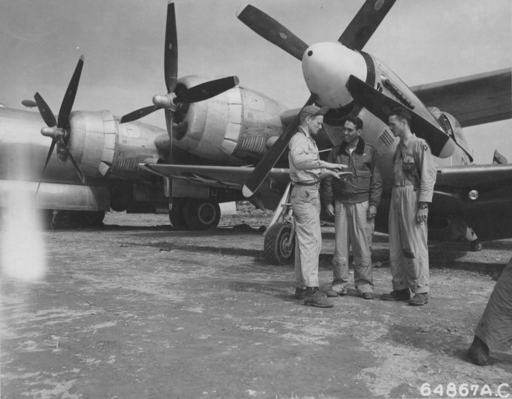 In an obvious publicity photo, then Captain Crim (left) discusses fighter tactics with Brig. General Ernest M. “Mickey” Moore, while Major DeWitt Spain listens in front of a 531st FS Mustang parked under the wing of a B-29.