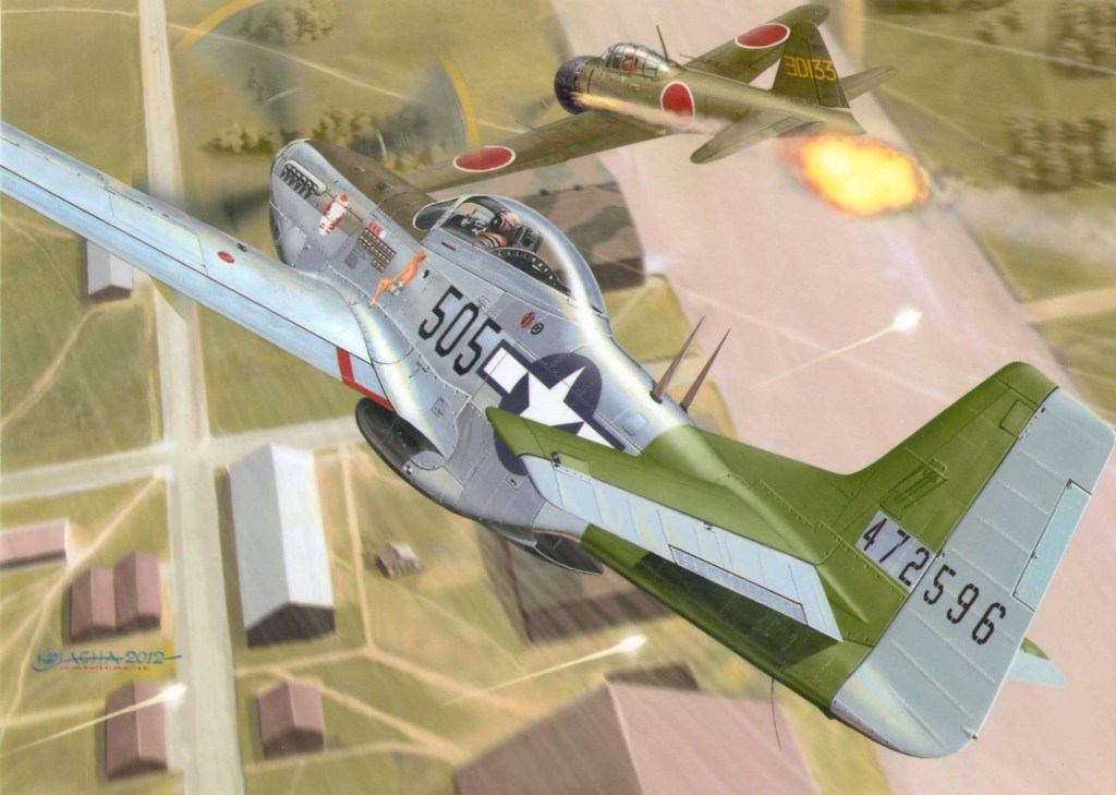 His next opportunity to score came on August 10, 1945, on a VLR mission escorting B-29s to the northeast of Tokyo. Captain Aust shot down a Mitsubishi Zero at 25,000 feet for his first victory of the day. He quickly spotted another Zero and made two passes damaging his adversary’s plane both times. After the second pass, the Zero dived into clouds and disappeared. Captain Aust was able to spot a third Zero, get behind it, and shot it down over an airfield for this second victory of the day, and his fifth aerial victory of the war.