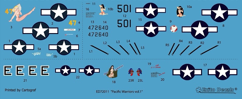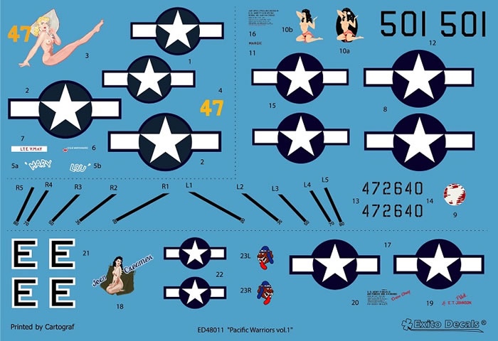 They recently released their 11th decal sheet entitled “Pacific Warriors” vol. 1, which includes decals for “501”, a 457th FS/506th FG P-51D-25-NA (44-72640) flown by Captain Evelyn Neff.