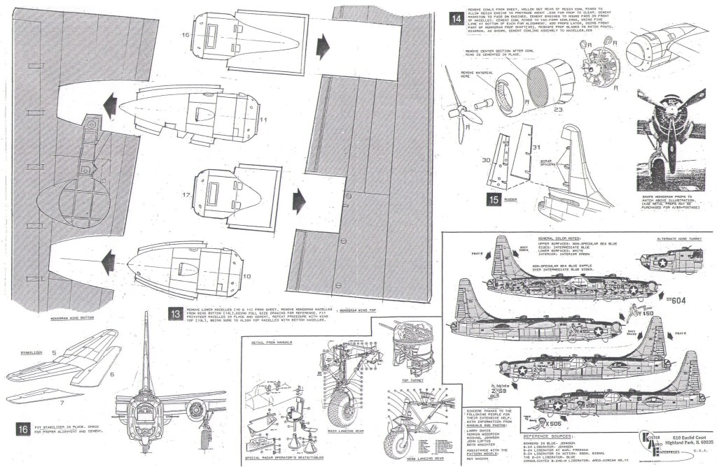 As you can see from the instructions below, the conversion kit uses the fuselage center section (bomb bay area), wings, landing gear, propellers, and cockpit pieces from the Revell-Monogram kit. Either the B-24D or the B-24J version of the Revell-Monogram kit will work for this conversion.