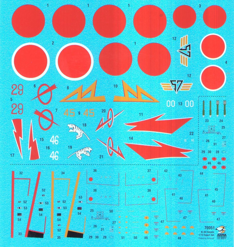 Six decal options are included in the Expert Set, which allows the modeler to choose between Home Defense Hayates, a Philippine based Hayate, and CBI based Hayate, and a kamikaze (57th Shimbu-tai). The decals are printed by Techmod.