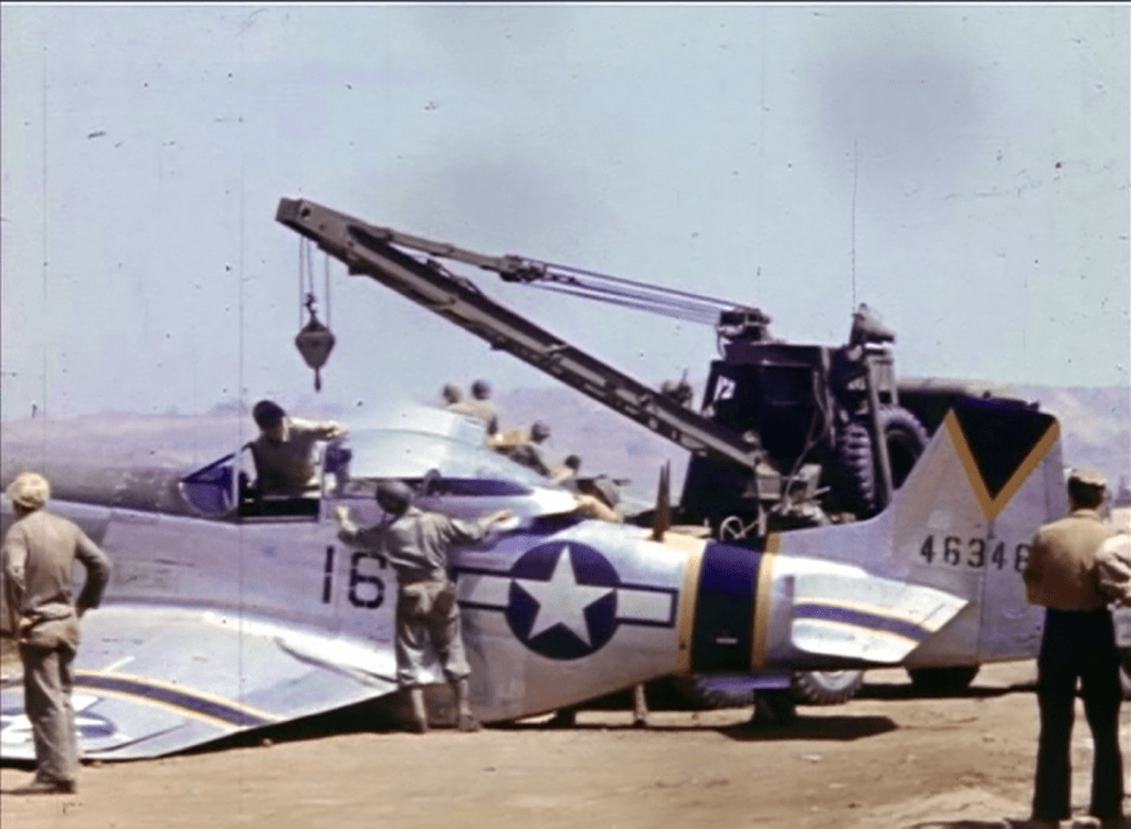 Now one more twist on the color of the bands: purple. What? Purple? Below is a still of color 16mm film taken on Iwo Jima after a 47th FS crash that Mark Stevens forwarded to me while I was doing research for this post. Mark stated that several members of the 47th FS indicated that the darker portion of the bands was either dark blue or purple. All very interesting; but not sure what to think about using purple.
