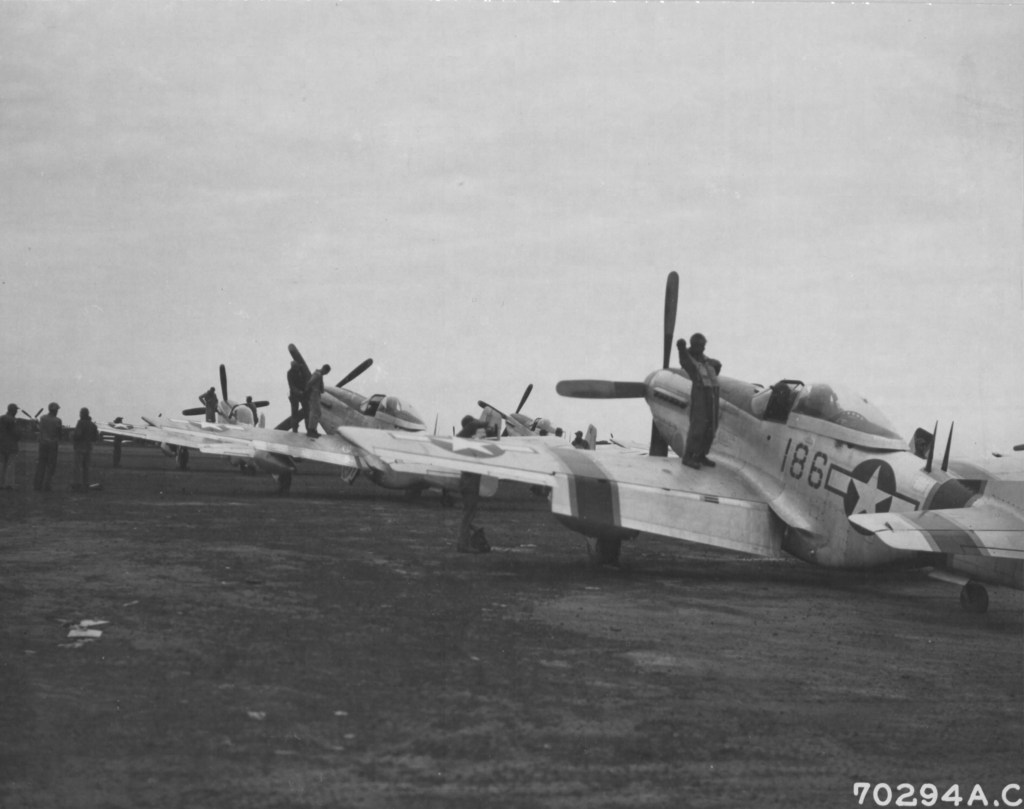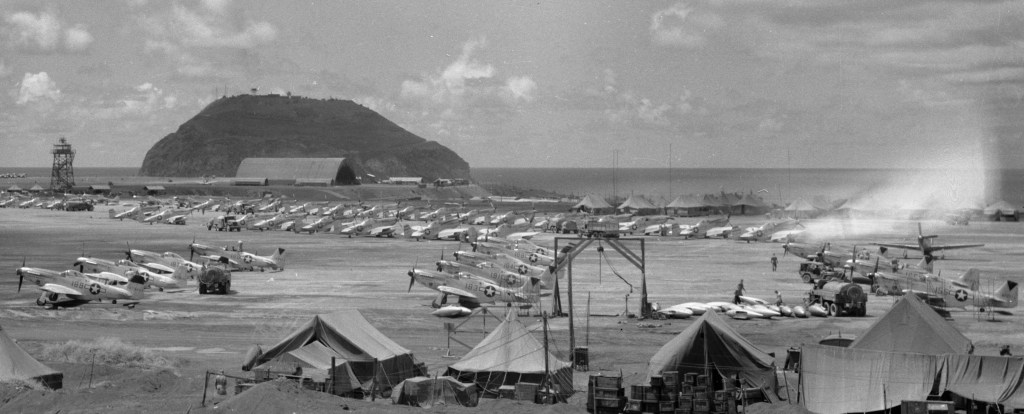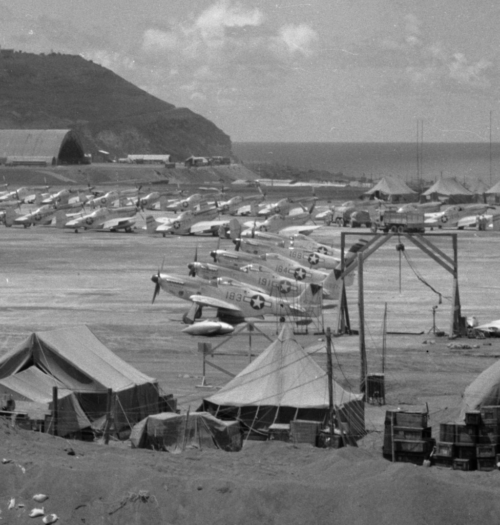 The photo below shows three rows of 47th FS Mustangs with Mt. Surbachi in the background. This is an interesting photo due to the varied markings on the planes. The drop tanks between the second and third rows are the 165 gallon P-38 type tanks.