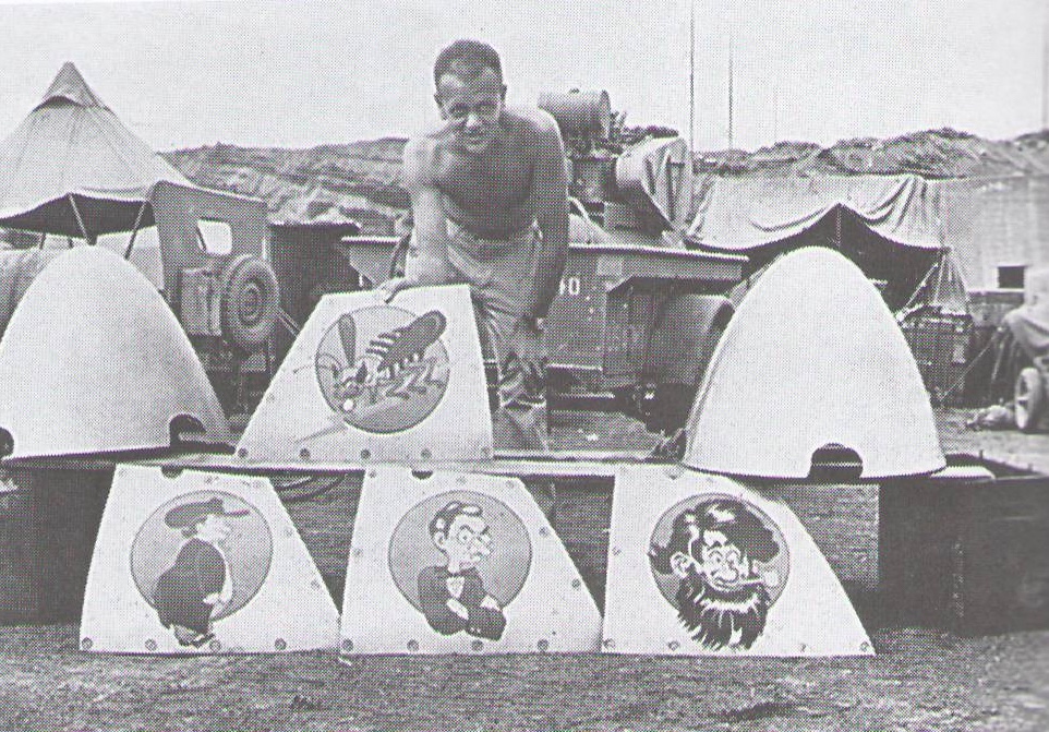 The fuselage numbers for the 47th Fighter Squadron Mustangs were 150 through 199. During their time in the Central Pacific, the 47th FS adopted the nickname the “Dogpatchers”, and began naming their aircraft for the characters of the then popular comic strip “Li’l Abner” by Al Capps. When the 47th received its Mustangs, the squadron emblem was painted on the left side of the cowl, and the comic strip character on the right side.