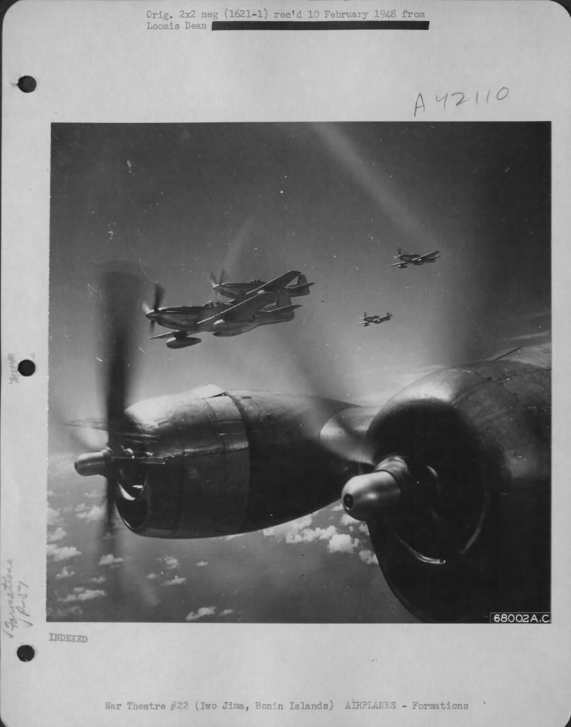 All three photos were taken on the same flight, and what is interesting is that the P-51D Mustangs have no identifying squadron markings, and if there are any plane numbers, you cannot see them due to them being blocked by the wings. In addition, it appears that the twin Uncle Dog antennae have not been installed because the normal antenna has not been moved to the bottom of the fuselage in front of the wheel wells. The twin Uncle Dog antennae were installed in the field on Iwo Jima, and did not become factory installed until Block 30s.