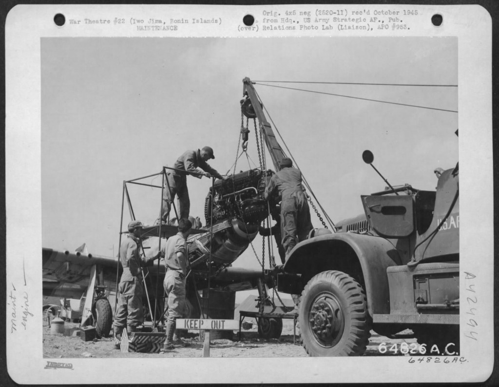 The official USAAF caption to this photo reads: Mechanics removing engine from a North American P-51 “Mustang”. Iwo Jima, Bonin Islands.