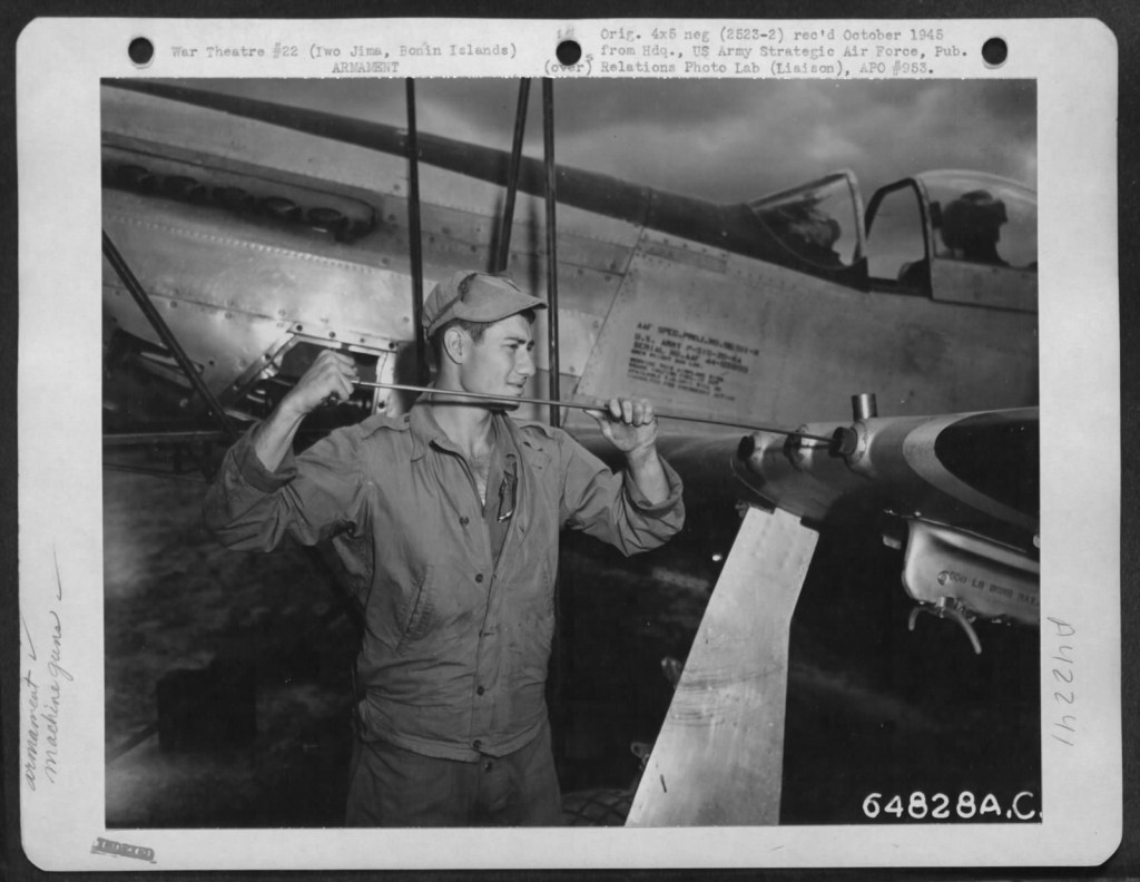 An armorer cleans the blast tubes on a 47th Fighter Squadron P-51D Mustang while other maintenance is being performed. The official United States Army Air Force caption to this photo reads: Armorers cleaning 50 cal machine guns on wing of North American P-51 “Mustang”. Iwo Jima, Bonin Islands.