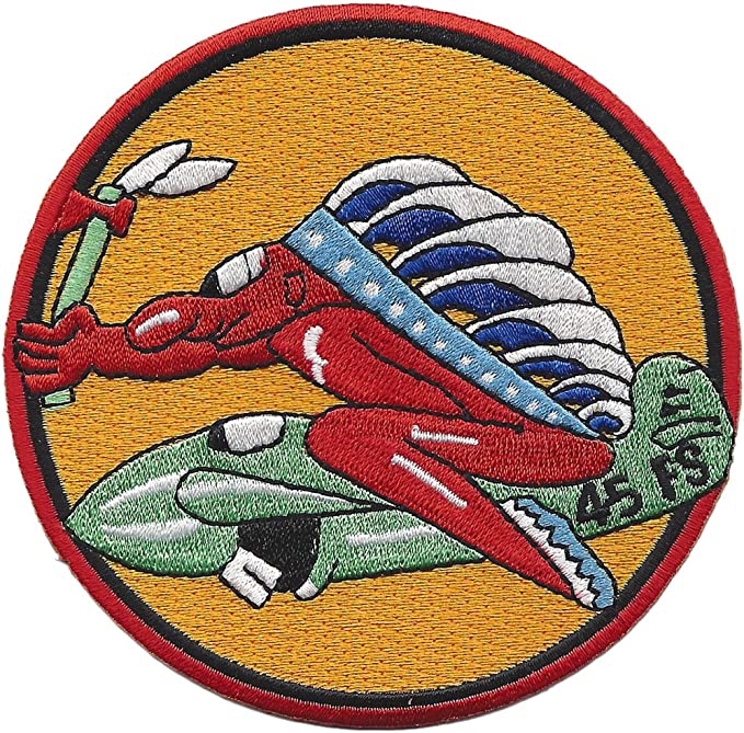 The squadron emblem was a devilish looking hornet breathing fire, riding a lightning bolt on a blue background.